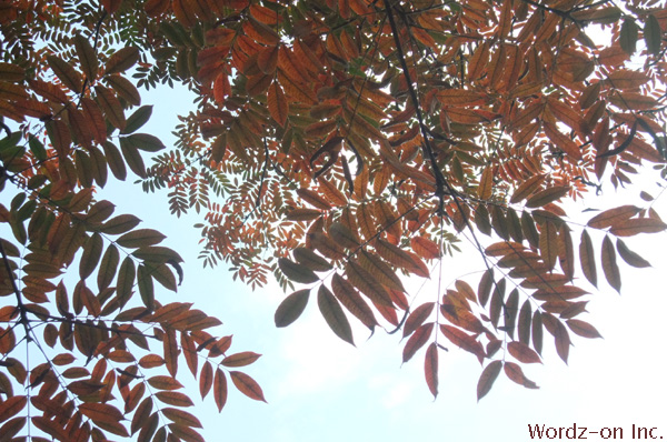 井の頭池のほとりに燃え立つ巨大なオレンジ色の木は、
